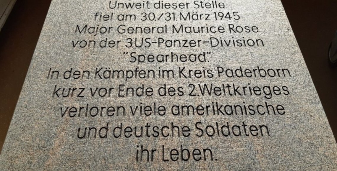 Vielleicht war ja auch der 30. März 1945 ein lauer und sonniger Frühlingstag. Major General Rose war auf einer Erkundungsfahrt zu seinen Truppen, als er auf der Dörenhagener Straße in der Nähe von Schloss Hamborn auf mehrere deutsche Kampfpanzer stieß. Er musste aus seinem Jeep aussteigen und sich einem deutschen Panzerkommandanten ergeben. Als Rose zu seiner Pistole griff, um sie entweder aus dem Holster zu nehmen oder aber mit dem Holster zu entfernen, wurde er von einem deutschen Soldaten erschossen. Er war der ranghöchste Offizier der US-Armee, der während des Zweiten Weltkrieges in Europa ums Leben kam. US-amerikanische Truppen beendeten hier vor Ort das Kriegsgeschehen. Damit verbunden ist auch die Befreiung des hiesigen Konzentrationslagers Niederhagen in Wewelsburg. Am 8. Mai 1945 endete der Zweite Weltkrieg offiziell in Europa.