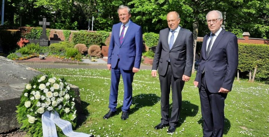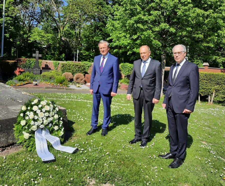 Paderborn. Am 8. Mai jährte sich das Ende des Zweiten Weltkrieges zum 77. Mal. Dies nahmen der Kreisvorsitzende des Volksbundes Manfred Müller, Landrat Christoph Rüther und Bürgermeister Michael Dreier zum Anlass gemeinsam aller Toten des Zweiten Weltkrieges zu gedenken und einen Kranz auf dem Paderborner Ostfriedhof niederzulegen (siehe Foto). Dort haben 277 Tote aus dem letzten Krieg ihre Ruhe gefunden. Vor der Friedhofskapelle sind überwiegend zivile Opfer der Bombenangriffe auf die Stadt Paderborn in Sammelgräbern beigesetzt.